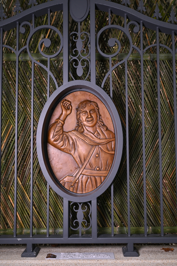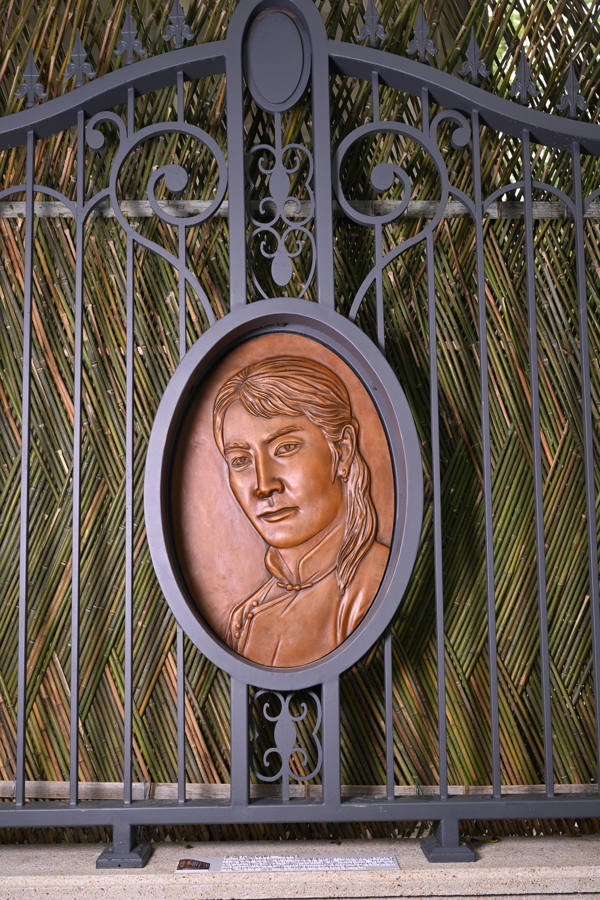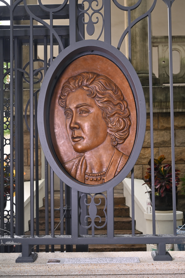 稍稍辨认,不难认出,铜像上秦怡的剧照出自电影《海外赤子》。